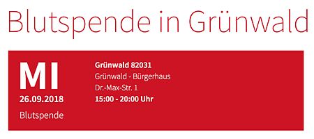 Am kommenden Mittwoch, den 26.09.2018 findet wieder eine Blutspendeaktion in Grünwald statt. Im Zeitraum von 15 bis 20 Uhr stehen wieder die Türen des Bürgerhauses in der Dr.-Max-Straße für Spendewillige offen!