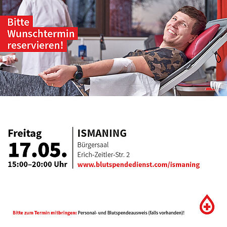 Blutspendetag in Ismaning am Freitag, 17. Mai 2024: Werde Lebensretter!